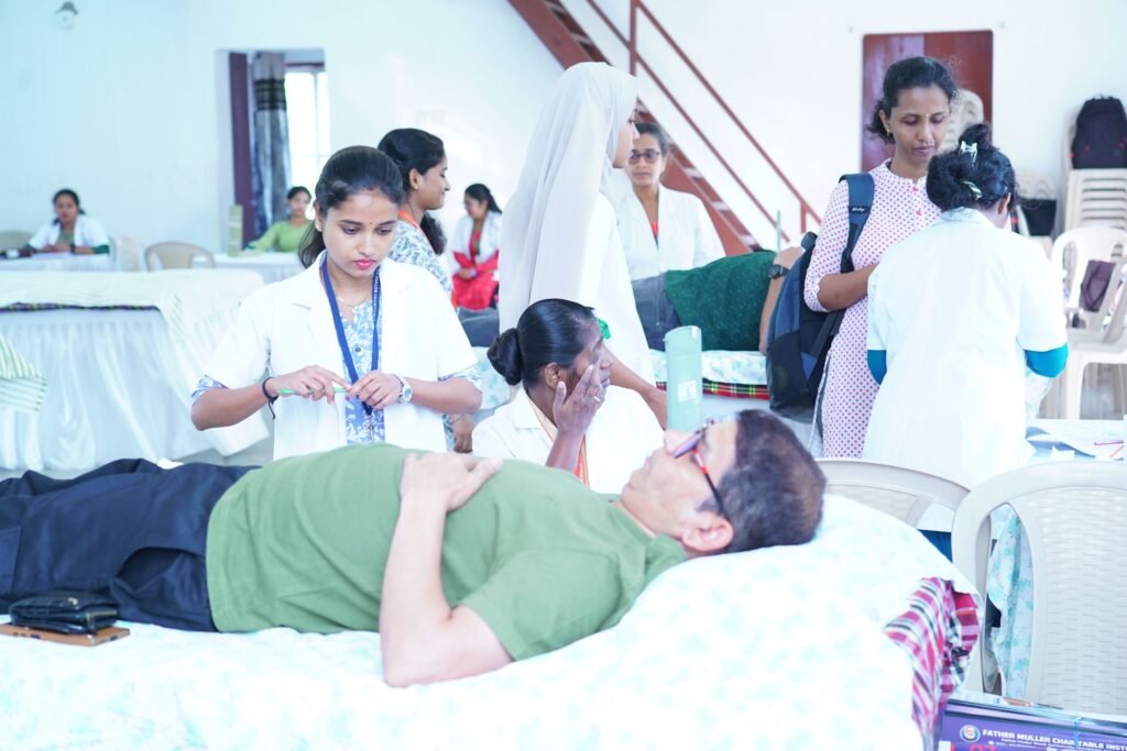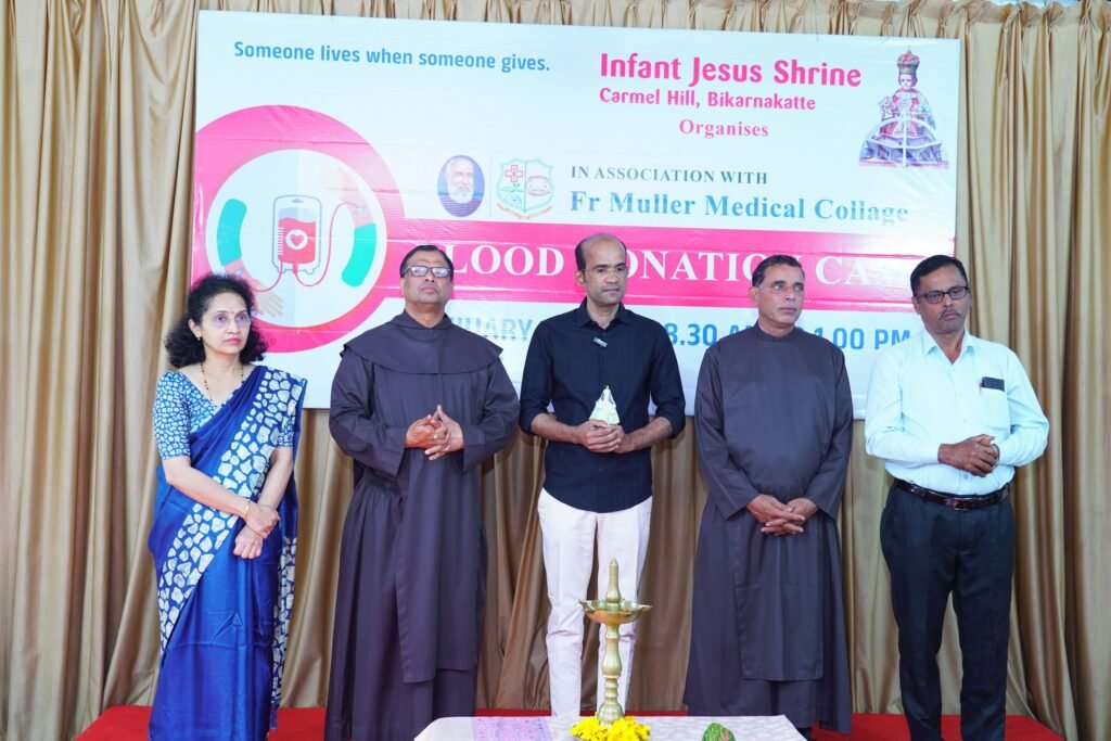 As part of the day’s observances, the Infant Jesus Shrine, in collaboration with Father Muller Medical Institutions, organized a blood donation camp to promote voluntary blood donation and encourage community participation in saving lives. The camp was formally inaugurated by Mr Anil Lobo, Chairman of MCC Bank, in the presence of Dr Kirana Piloor of Father Muller Medical College, Fr William Miranda of Carmel Jyothi Charitable Trust, Fr Melvin D’Cunha, Superior of St Joseph’s Monastery, Fr Stifan Perera, Director of the Infant Jesus Shrine, and Mr Dolphy D’Souza.